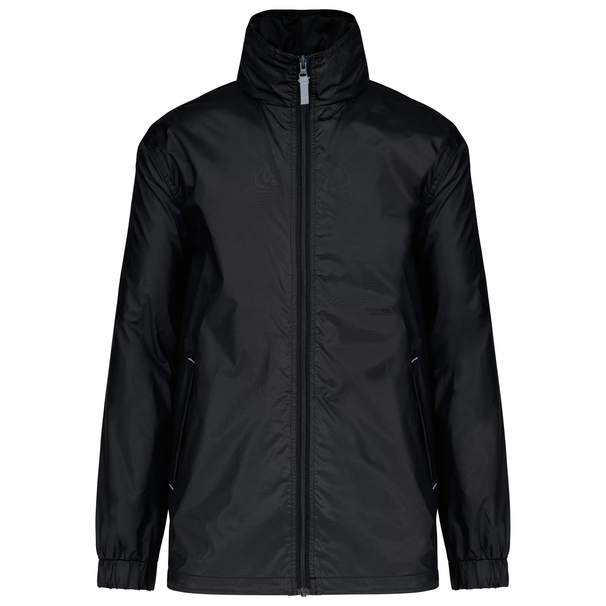 100% polyamide 210 T avec enduction acrylique. Fermeture zippée. 2 poches sur le devant avec points d'arrêt contrastés. 1 poche intérieure. Doublure corps en 100% polyester : 3/4 en polytricot et 1/4 en filet. Doublure manches en 100% polyester. Cordon élastique de serrage au bas du vêtement avec stoppeurs. Capuche dans le col.