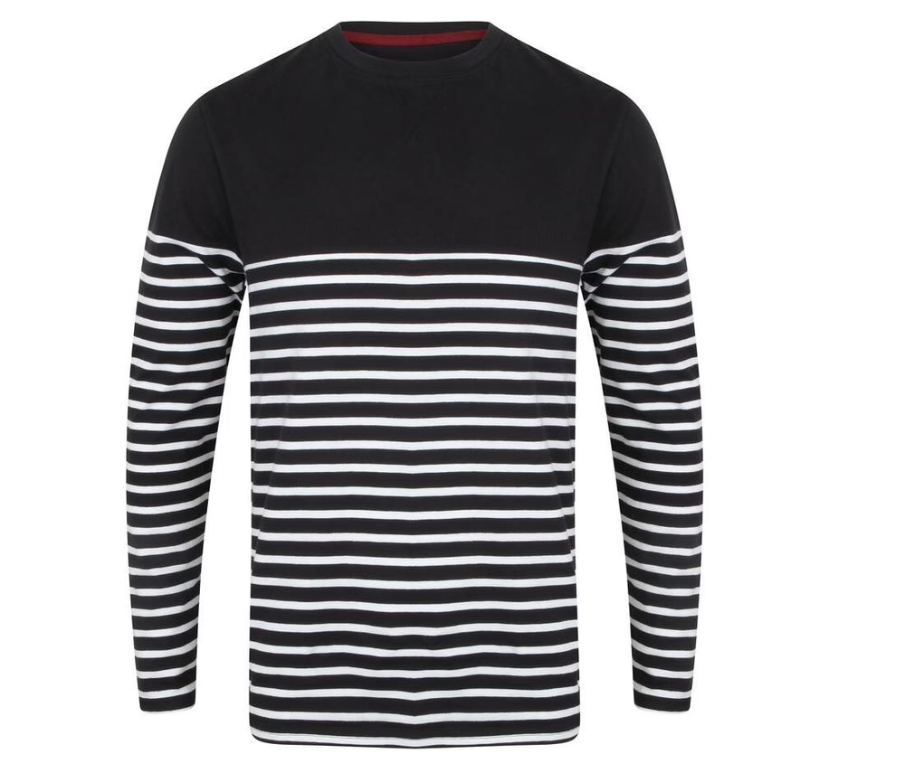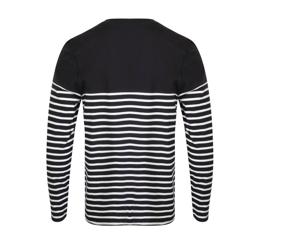 100% coton jersey. T-shirt unisexe épais à manches longues, coupe classique sans étiquette. Col rond avec encolure côtelée extensible. Ourlet et couture des manches en double surpiqûre. Motif de couture plate en forme de "V" au niveau de l'encolure. Partie inférieure rayée.