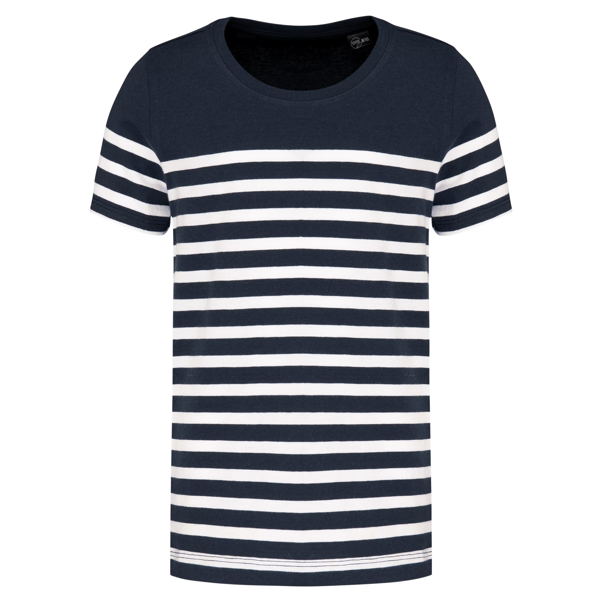 100% coton biologique. Coupe droite. Lavage aux enzymes. Encolure ronde avec bord-côte 1x1. Rayures tricotées. Bande de propreté au col. Finition double aiguille bas de manches et bas de vêtement.