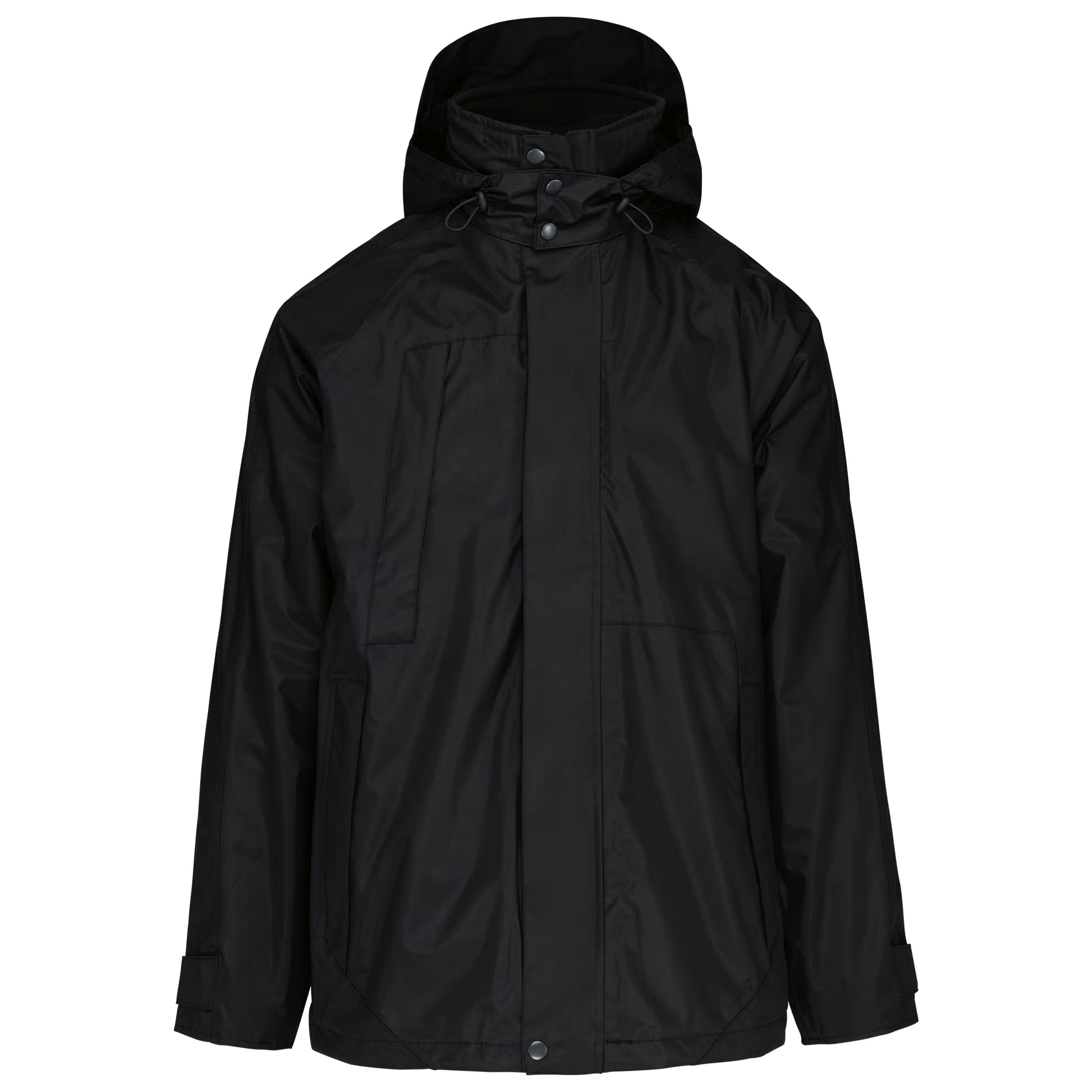 100% polyester enduction PVC. Coutures thermosoudées étanches. Parka 3 en 1 : doublure intérieure bi-matière. Corps : filet 100% polyester. Manches : 100% polyester. Fermeture zippée et patte de boutonnage à pressions. Intérieur col polaire. 3 poches devant zippées avec rabat. Pattes de serrage bas de manches auto-agrippantes. Capuche amovible doublée en filet avec boutonnage à pressions + stoppeurs. Zip intérieur pour personnalisation. Veste polaire : micropolaire 100% polyester. Manches doublées 100% polyester pour faciliter le passage des bras. Fermeture zippée. 2 poches côté. Veste polaire amovible rattachée à la parka par fermeture zip.