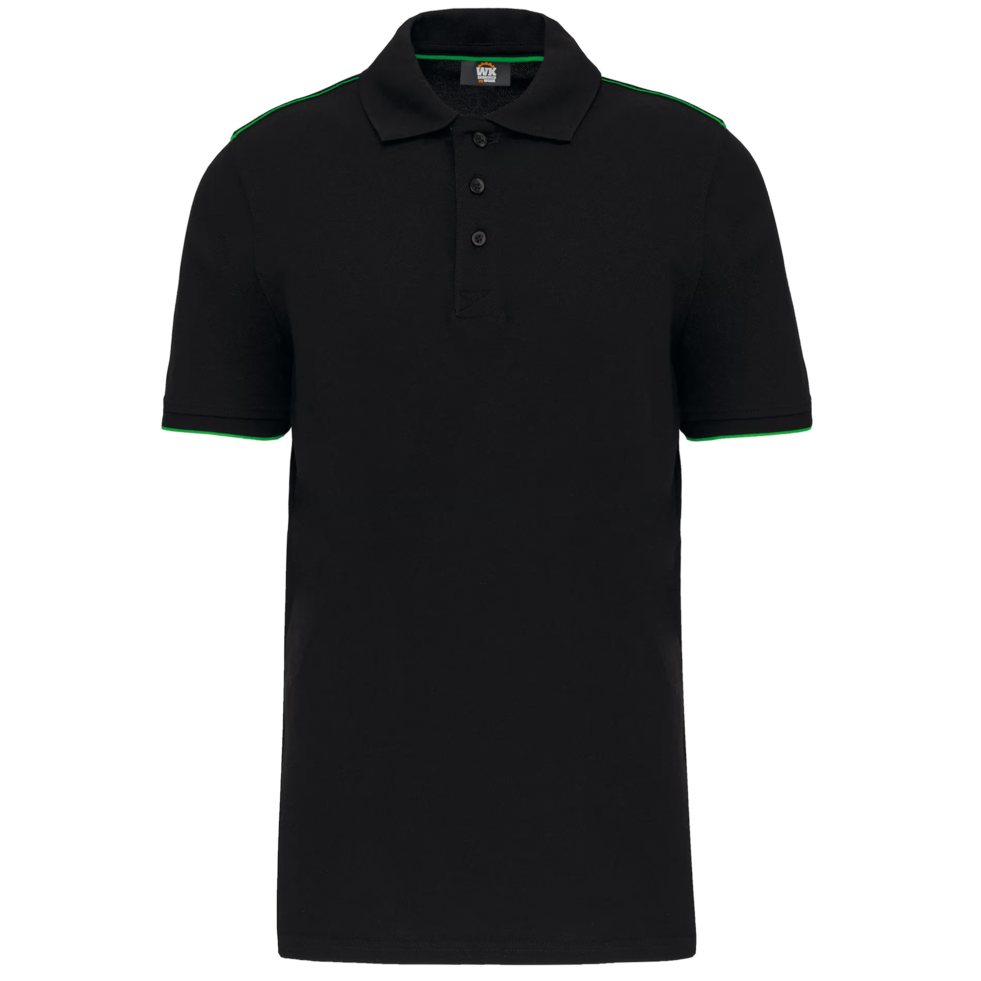 65% polyester / 35% coton. Coton peigné. Maille piquée. Lavable à 60°C. Traitement antiboulochage. Patte 3 boutons avec bande intérieure contrastée. Col en bord-côte avec bande de propreté. Passepoil contrasté intérieur col et épaules. Finitions bord-côte avec liseré contrasté au bas de manches. Fentes latérales avec bande chevron contrastée pour plus de confort. Finition double aiguille au bas de vêtement. Idéal pour une utilisation quotidienne.