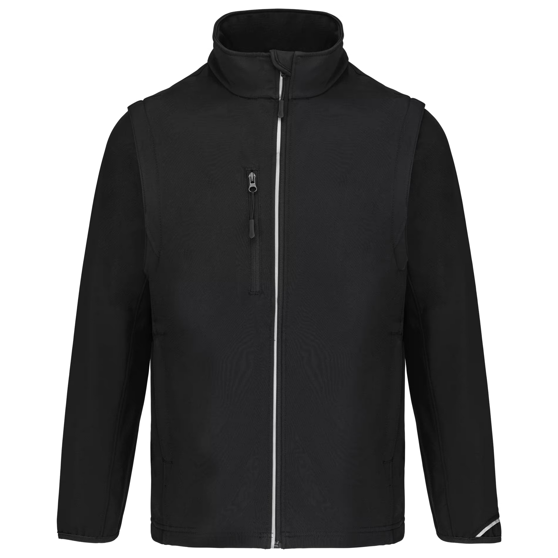95% polyester / 5% élasthanne. Tissu contrecollé 3 couches respirant 3000 g/m² /24h et imperméable 8000 mm. Extérieur 95% polyester et 5% élasthanne. Membrane intermédiaire respirante. Couche intérieure micropolaire. Fermeture zippée avec passepoil réfléchissant. 2 poches latérales zippées et 1 poche poitrine zippée. Manches amovibles avec finition bande élastique et passepoil réfléchissant.