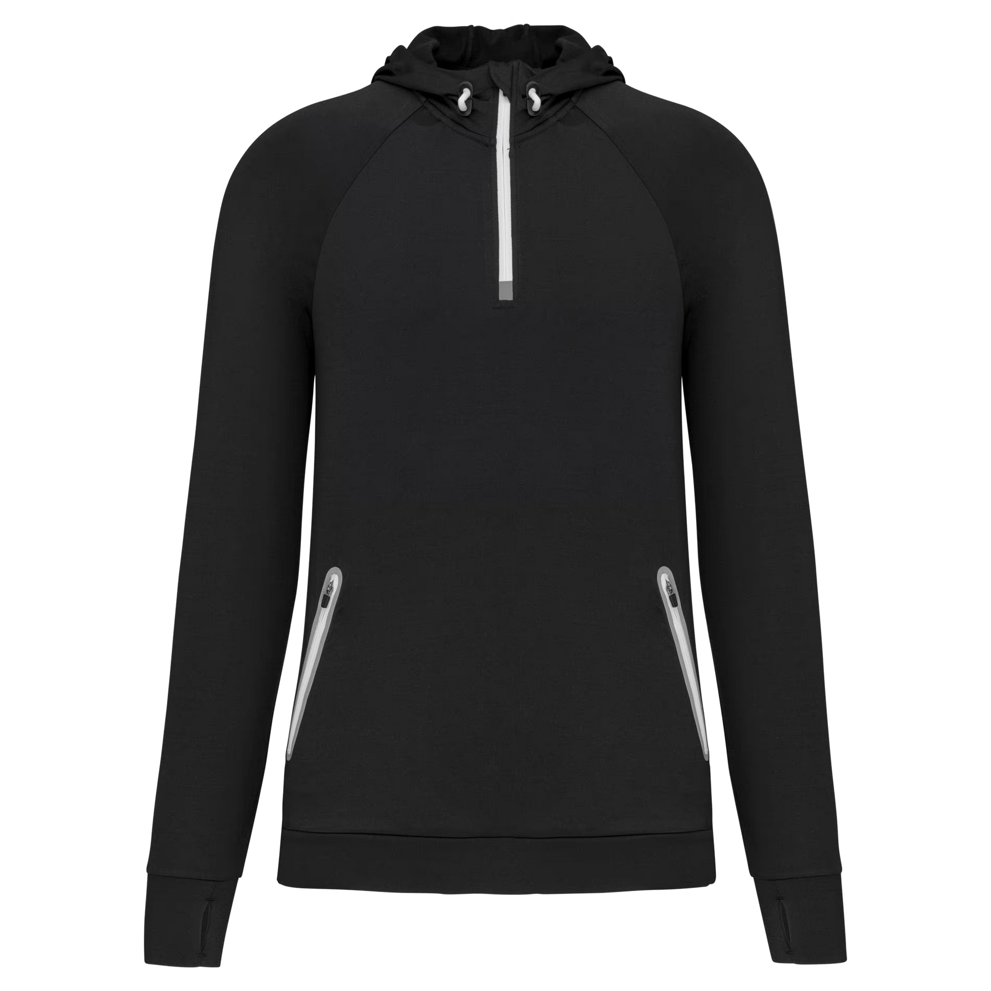 90% polyester / 10% élasthanne. Tissu jersey gratté ultra doux. Manches raglan. 2 poches zippées et réfléchissantes. Zips et cordons : White pour le coloris Navy, Black pour le coloris Red et Sport Grey Mélange et Lime pour le coloris Dark Grey.
