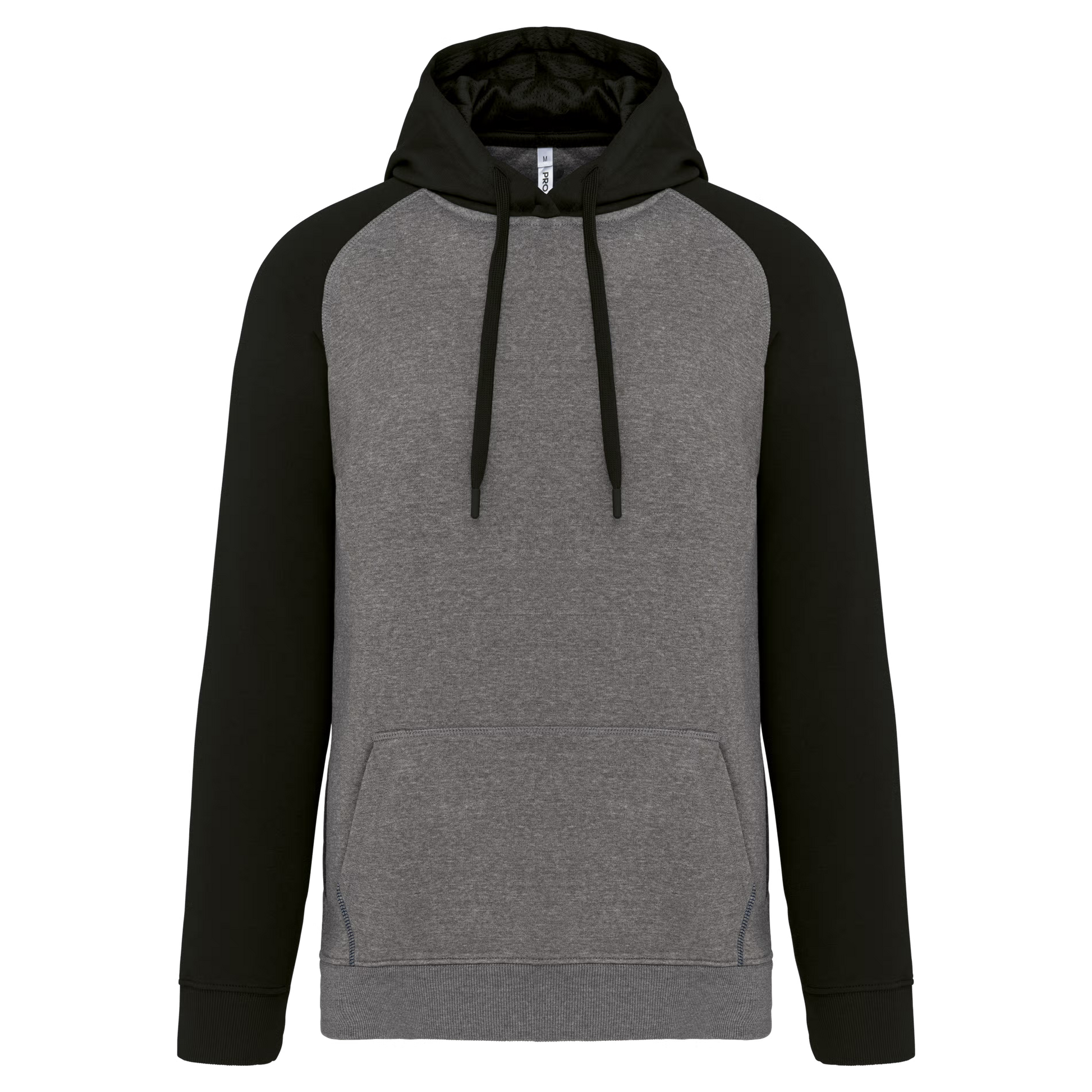 65% polyester / 35% coton. Molleton gratté. Manches raglan et capuche contrastées. Capuche doublée en maille filet ton sur ton. Poches kangourou avec poche téléphone fluorescente. Passe-fil écouteurs. Poignets et bas de vêtement en bord-côte double épaisseur 2 x 2